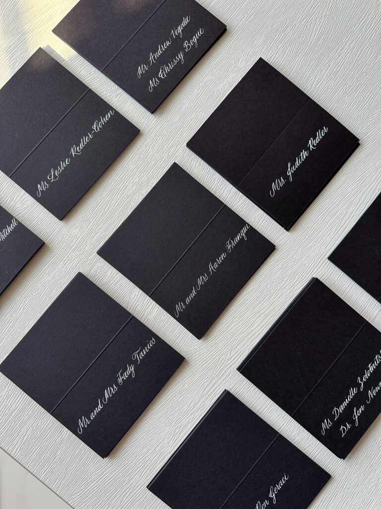 Professional calligraphy is more than beautiful handwriting—it’s art. Each stroke carries intention, care, and individuality. When you hire a calligrapher, you’re not just outsourcing writing or getting a computerized text that millions of others can replicate; you’re bringing in a skilled artisan who understands composition, balance, and personalization. No letter or word is ever created the same, so when you or your guests receive a calligraphed product, it is truly one-of-a-kind.