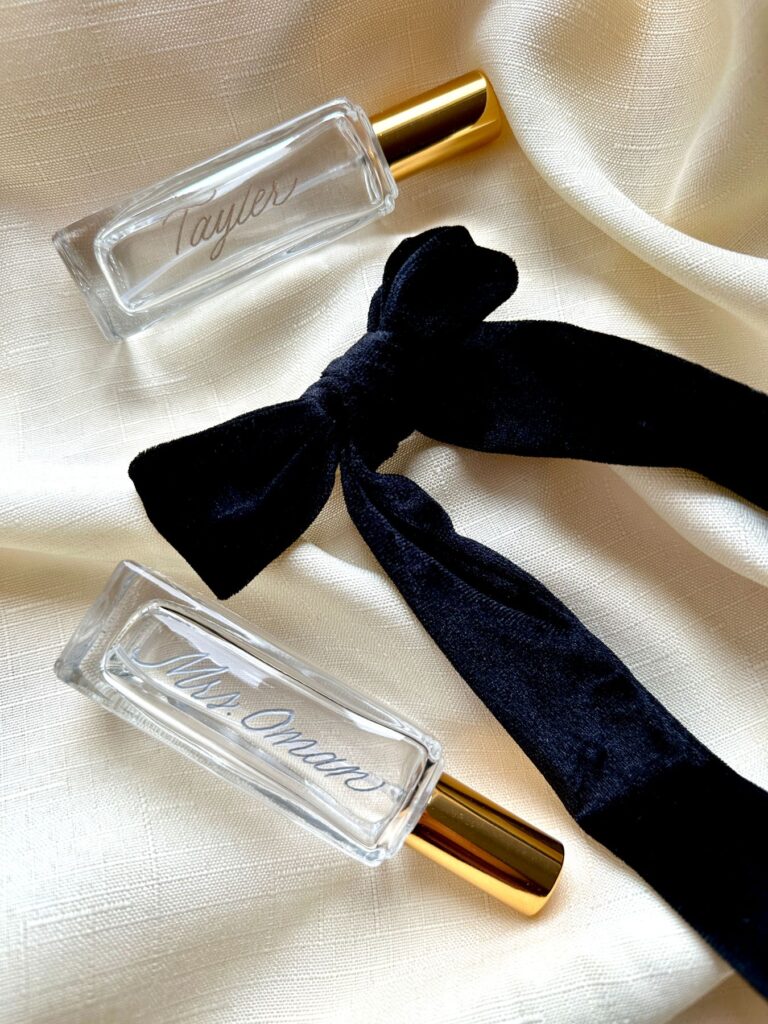 - Day-of-details – Hand engraved fragrances with “Bride”, “Groom”, “Mother of the Bride”, “Maid of Honor”, “Father of the Bride”, wedding dates, etc.